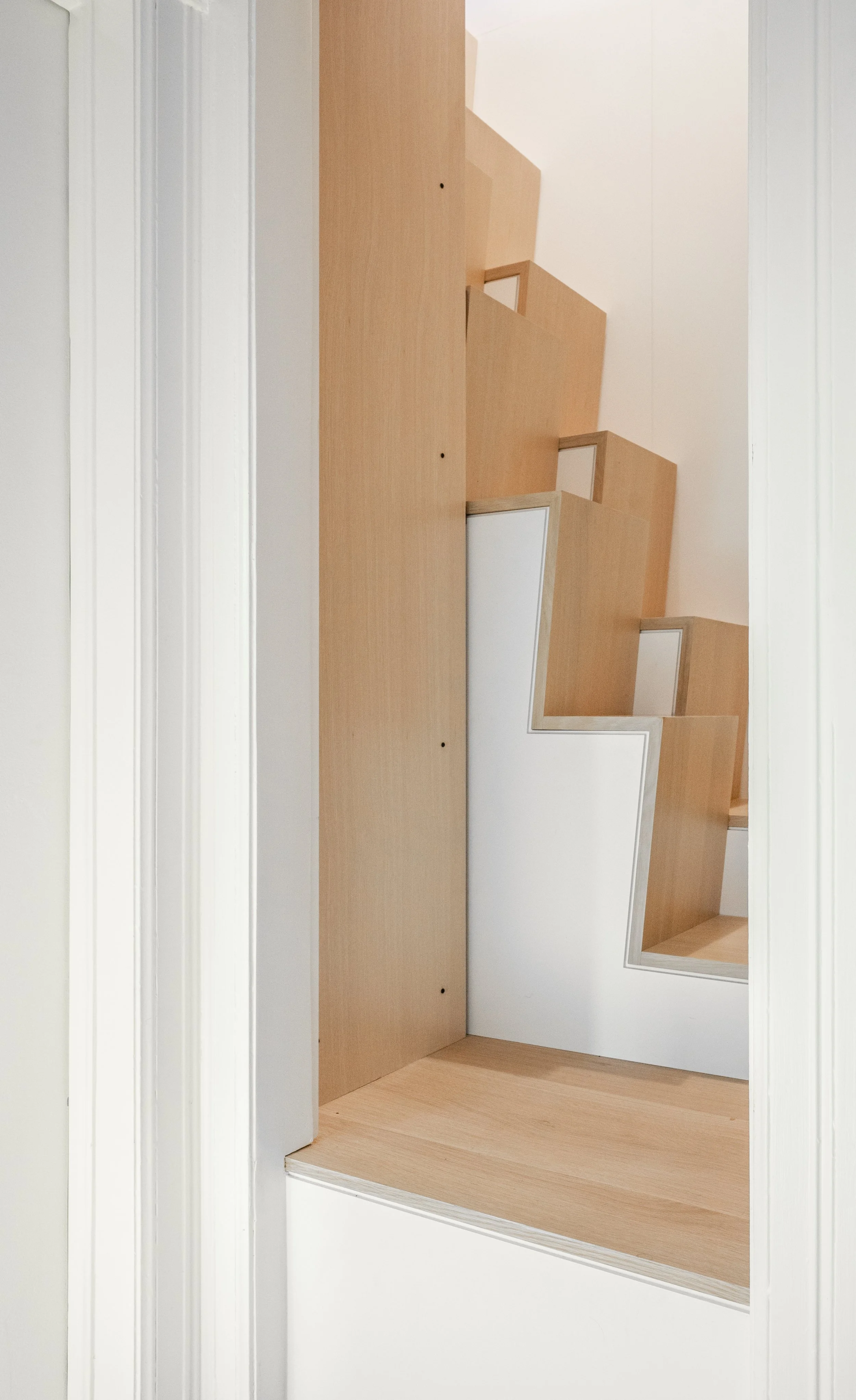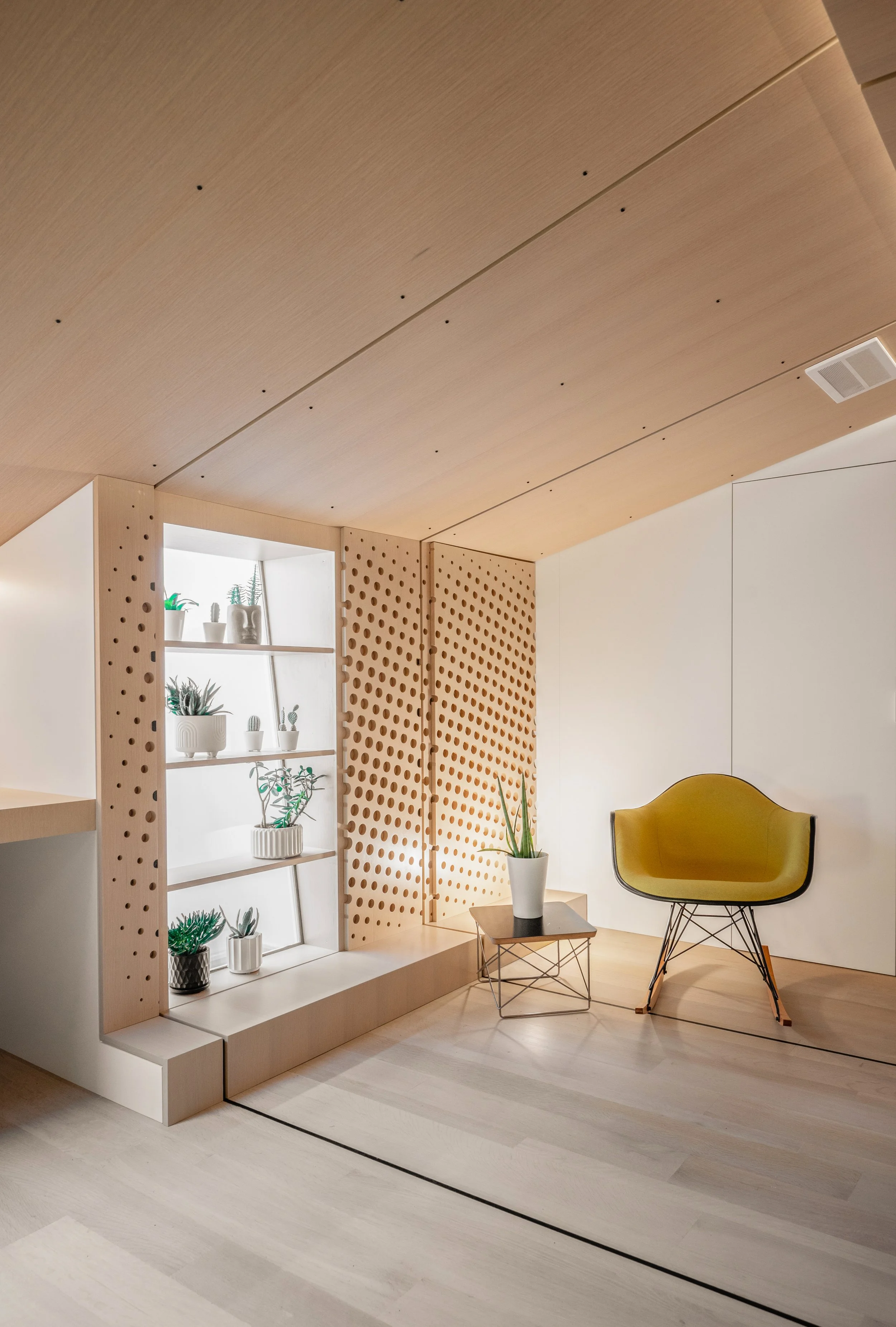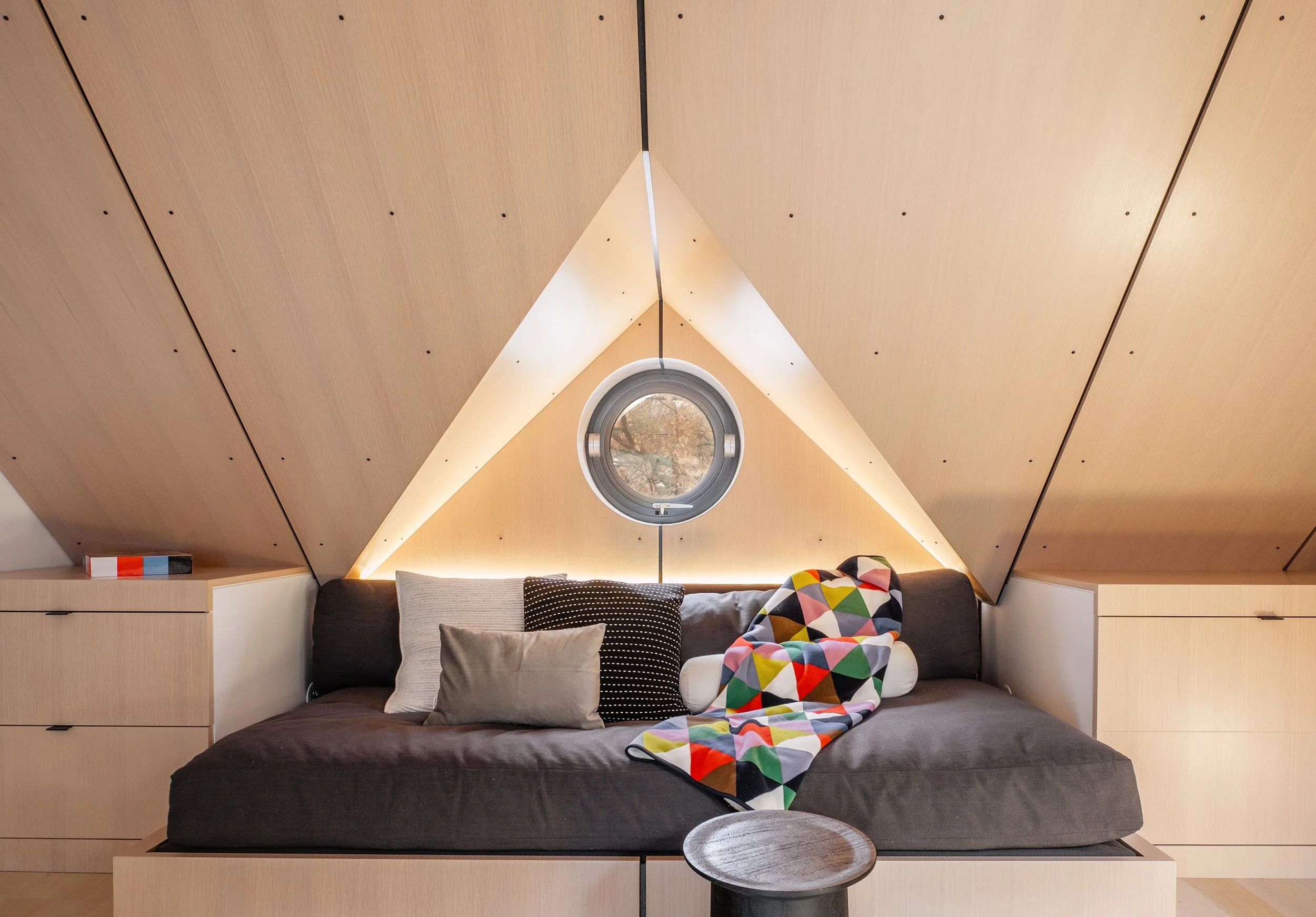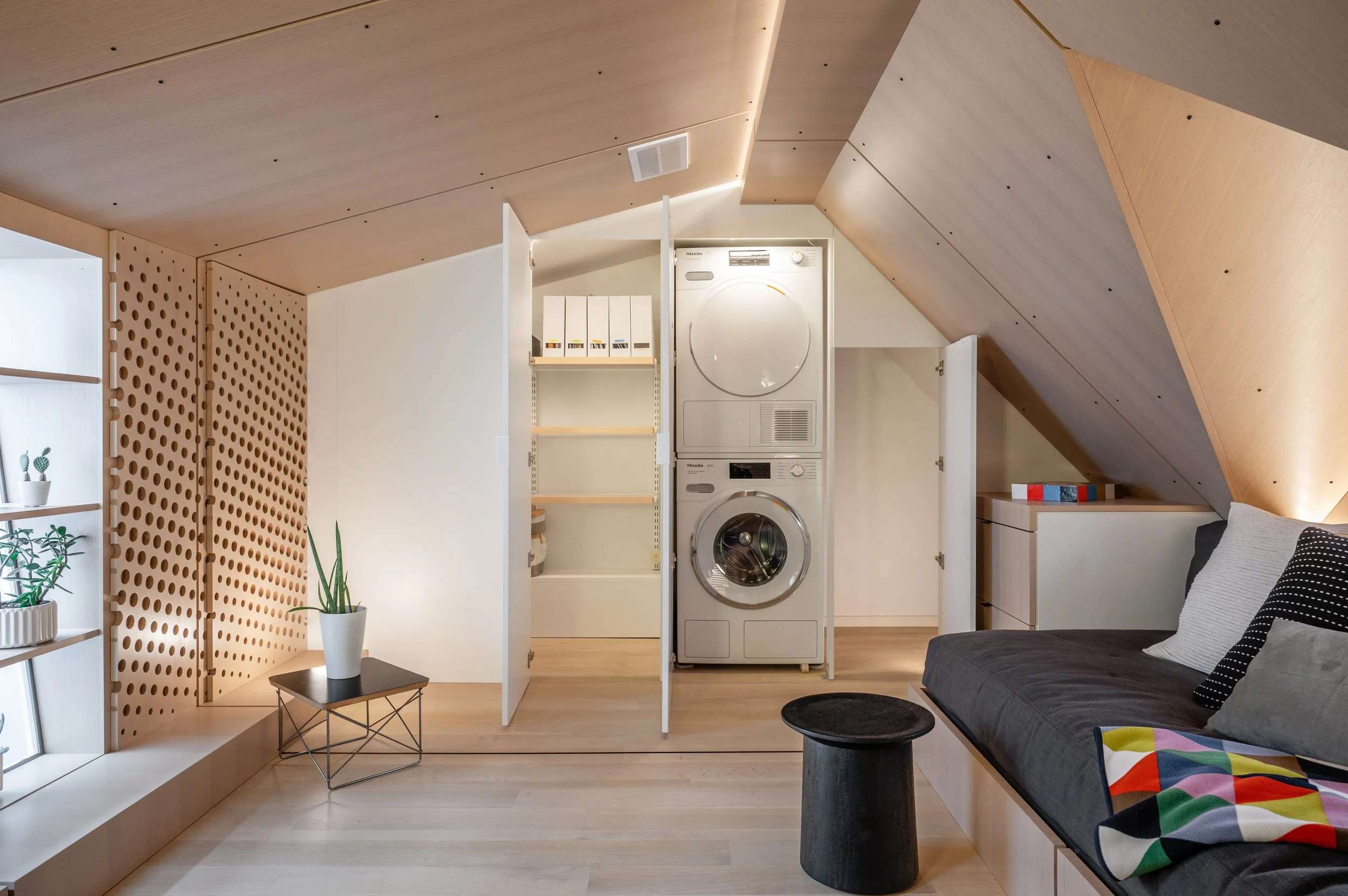 As the vision for the attic took shape, the design team approached the project with creativity and purpose. They introduced seven elegant ribbons crafted from custom-finished plywood, which gracefully wound around the room, seamlessly connecting the floor, walls, and ceiling. These unique features were not merely decorative; they integrated essential components such as a staircase, a dedicated workspace, filing cabinets, and a day bed for relaxation. The design maximized the limited space while ensuring functionality and aesthetics were harmoniously balanced. With each step of the renovation, the once-dark attic began to blossom into a bright and inviting oasis.